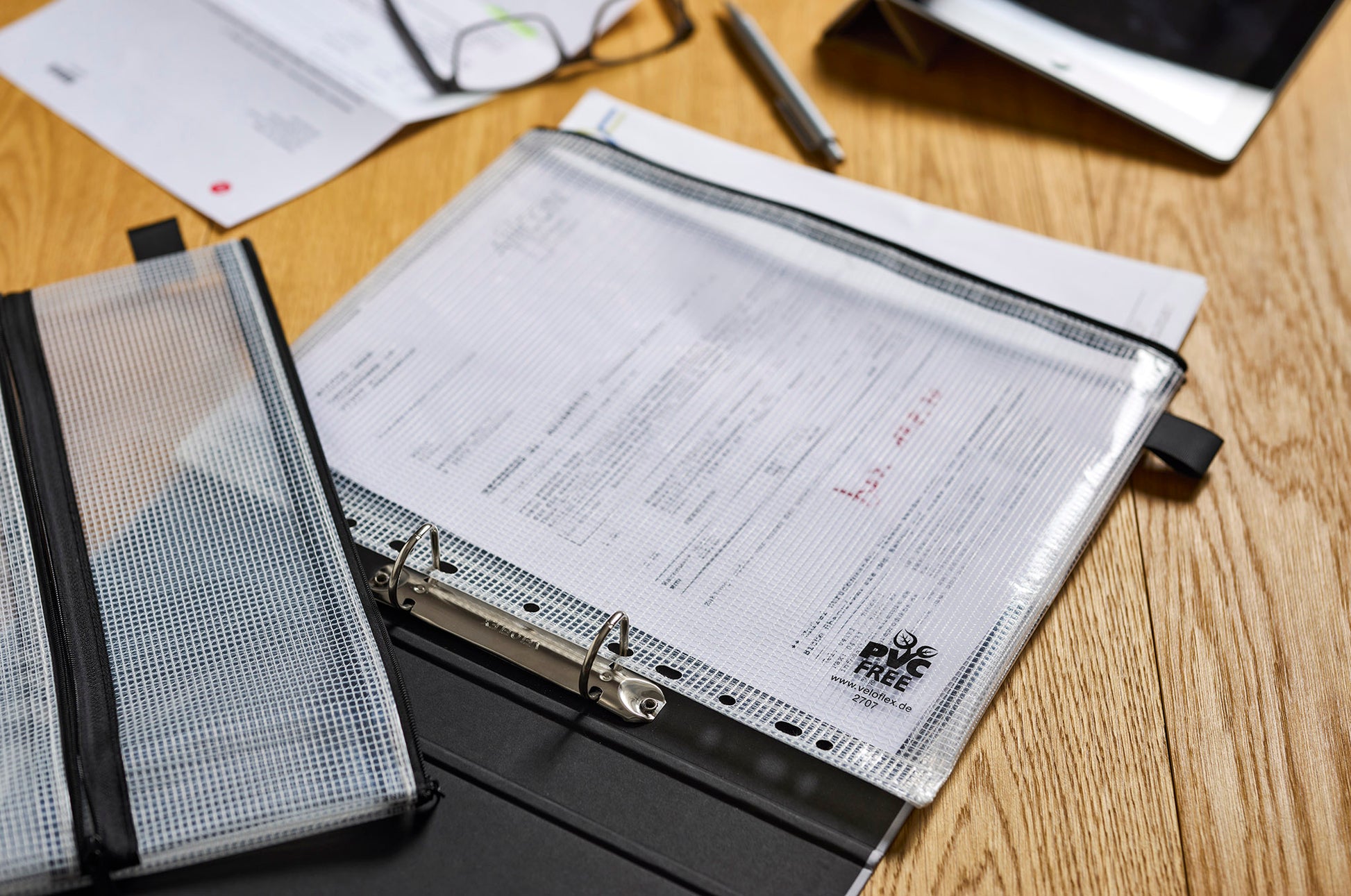 Zippered pocket, DIN A4 size 320 x 250 mm, with filing edge, made of fabric-reinforced EVA material 260 my thick, PVC-free, water-repellent and can also be used in wet areas, transparent