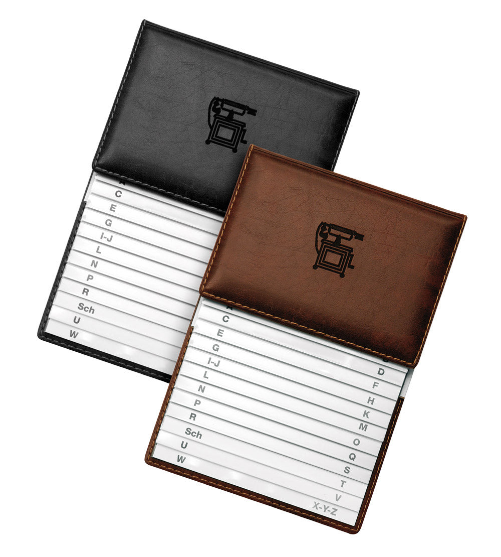 Telefonschuppenregister, 155 x 225 mm, gefertigt aus hochwertiger, griffsympathischer und besonders strapazierfähiger PVC -Weichfolie mit Geweberückseite, mit umlaufender Ziersteppnaht, mit hochwertigem Kunststoffregister, leicht aufklappbar, Taben geschützt, braun